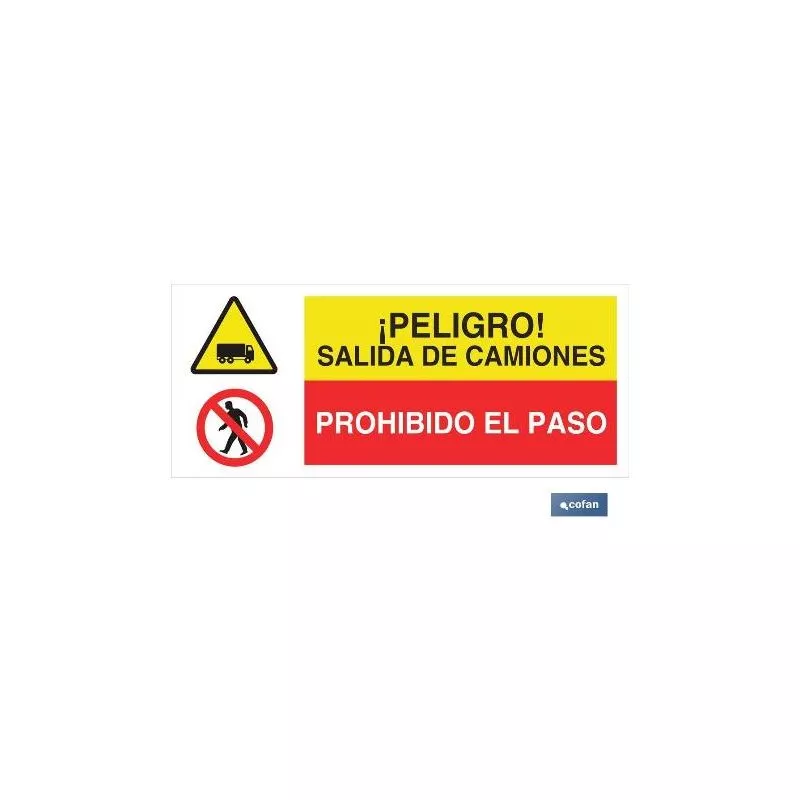 Señalización combinada de Peligro y prohibición. Medidas 507x210 mm y 717x297 mm Material Poliestireno. Pictograma y texto.ATENCIÓN PELIGRO SALIDA CAMIONES - PROHIBIDO EL PASO