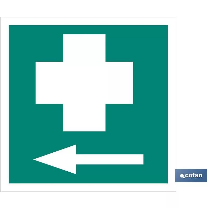 Señal luminiscente de evacuación botiquín izquierda. Tamaño y material a elegir.