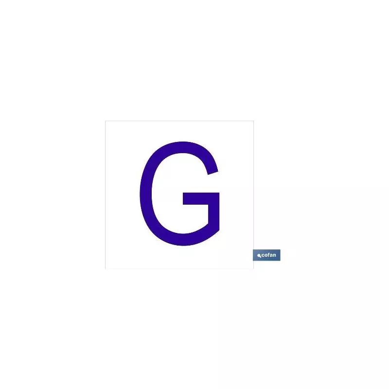 G Letra en glasspack adhesivo con el fondo blanco y carácter azul con medida en 62 x 62mm