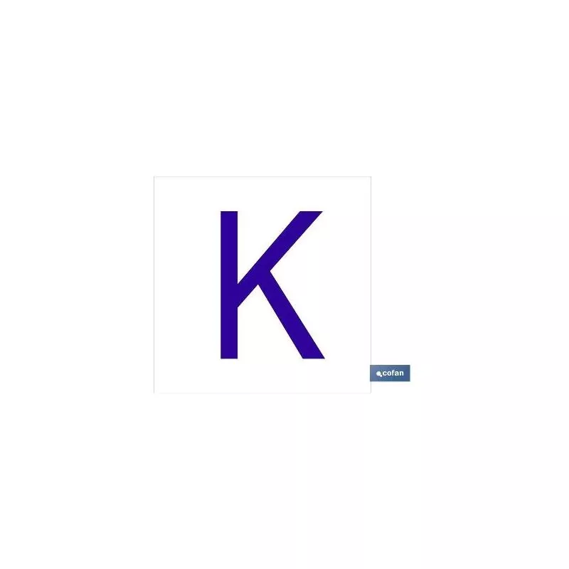 K Letra en glasspack adhesivo con el fondo blanco y carácter azul con medida en 62 x 62mm