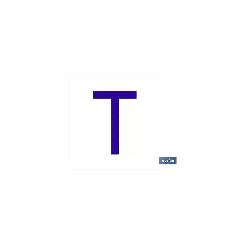 T Letra en glasspack adhesivo con el fondo blanco y carácter azul con medida en 62 x 62mm