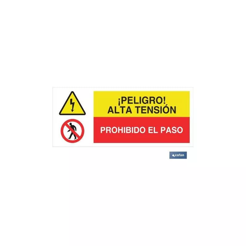 Señalización combinada de Peligro y prohibición. Medidas 507x210 mm y 717x297 mm Material Poliestireno. Pictograma y texto.ATENCIÓN PELIGROALTA TENSIÓN - PROHIBIDO EL PASO