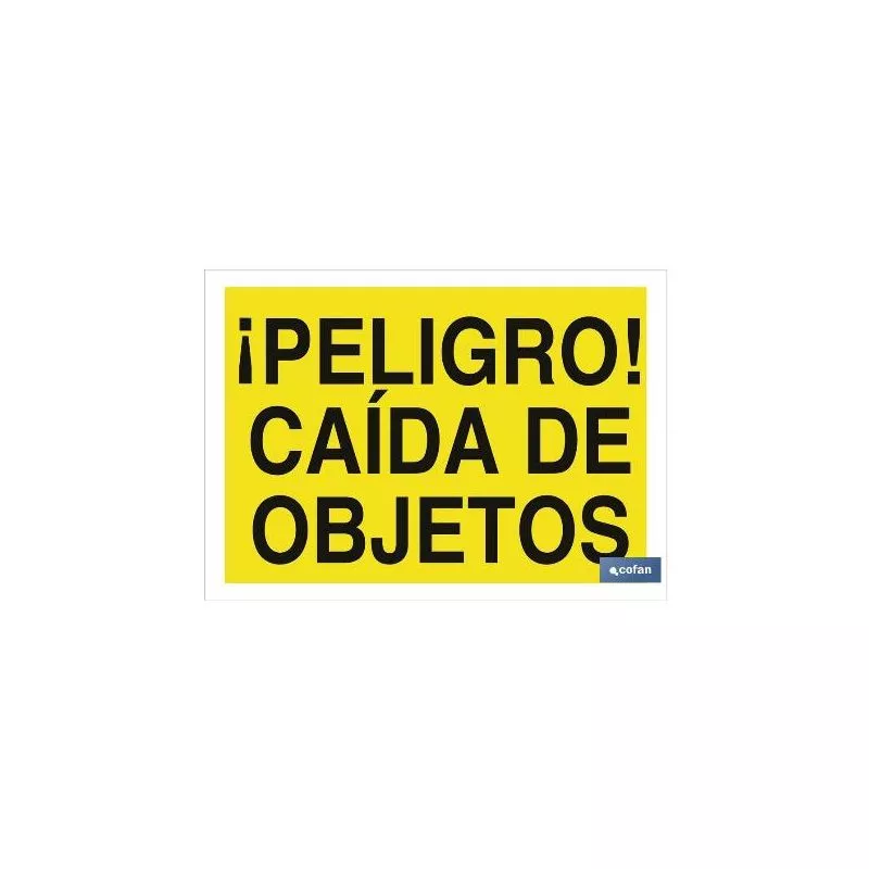 Señal de advertencia de peligro con texto caída de objetos. Tamaño y material a elegir.