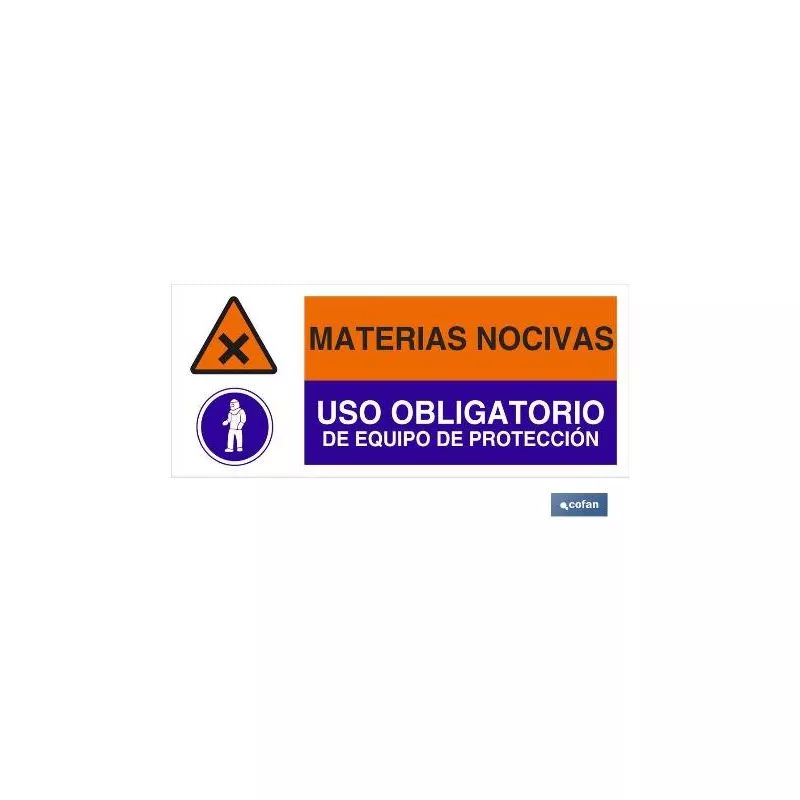 Señalización combinada de Peligro y Obligación. Medidas 507x210 mm y 717x297 mm Material Poliestireno. Pictograma y texto.MATERIAS NOCIVAS - USO OBLIGATORIO DE EQUIPO DE PROTECCIÓN