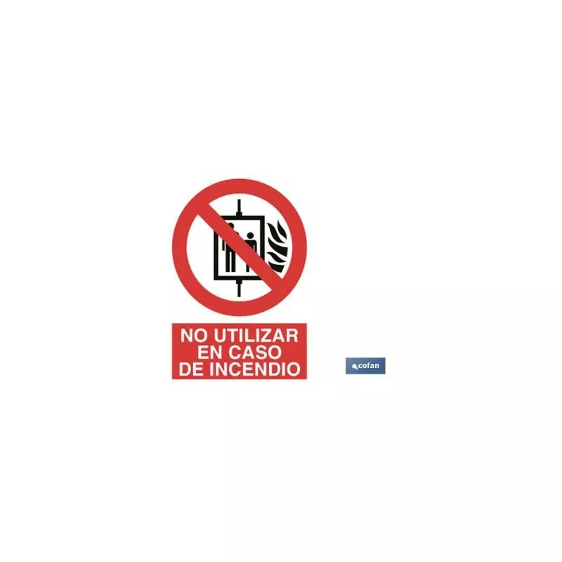 Señal Pictograma y Texto prohibido uso en caso de incendios en varias medidas y materiales.