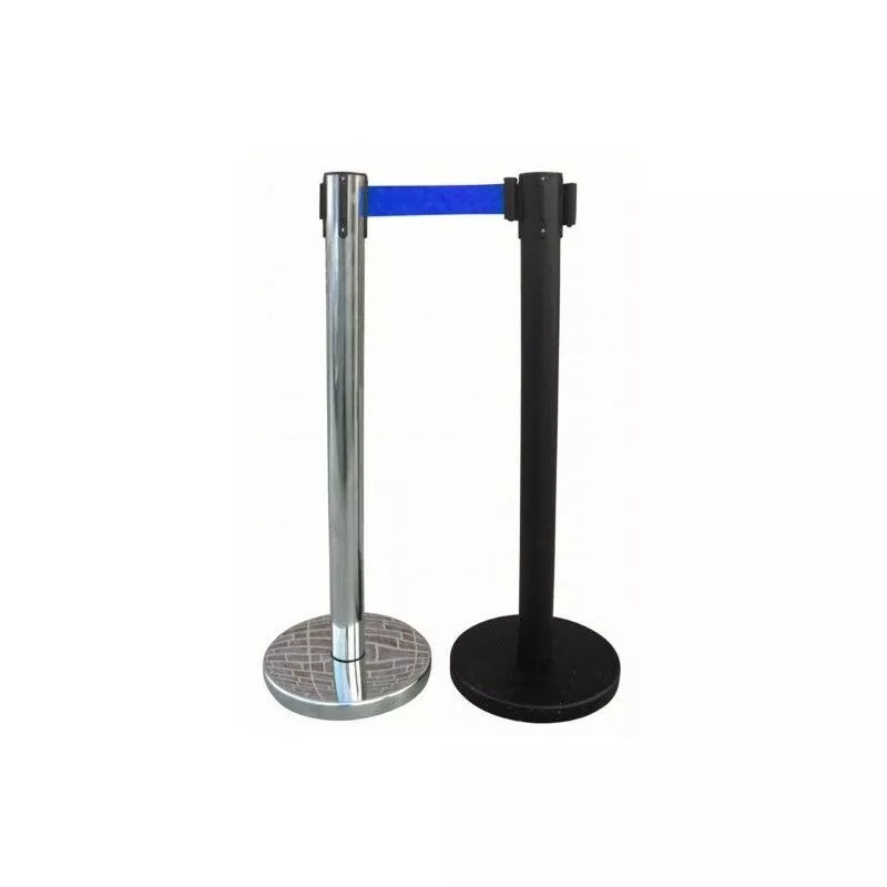 Poste separación metálico negro de 1 metro de alto , con cinta extensible Azul de 2 metros de largo y 5 centímetros de ancho