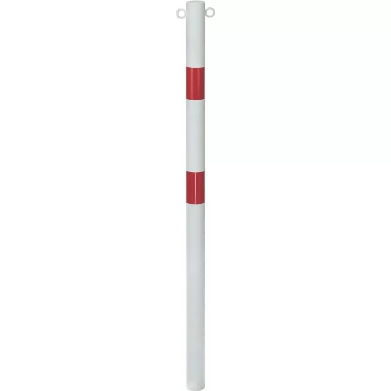 Postes de cordón SK "STANDARD" Para concreve Sin dosis en cadena, se utiliza como un límite y poste de cordón Con los muelles de cadena sirve para los propósitos del cordón Acero, galvanizado por fuego Plástico blanco revestido, con 2 anillos rojos, reflexivos Nota: la entrega se hace sin la manga del piso.
