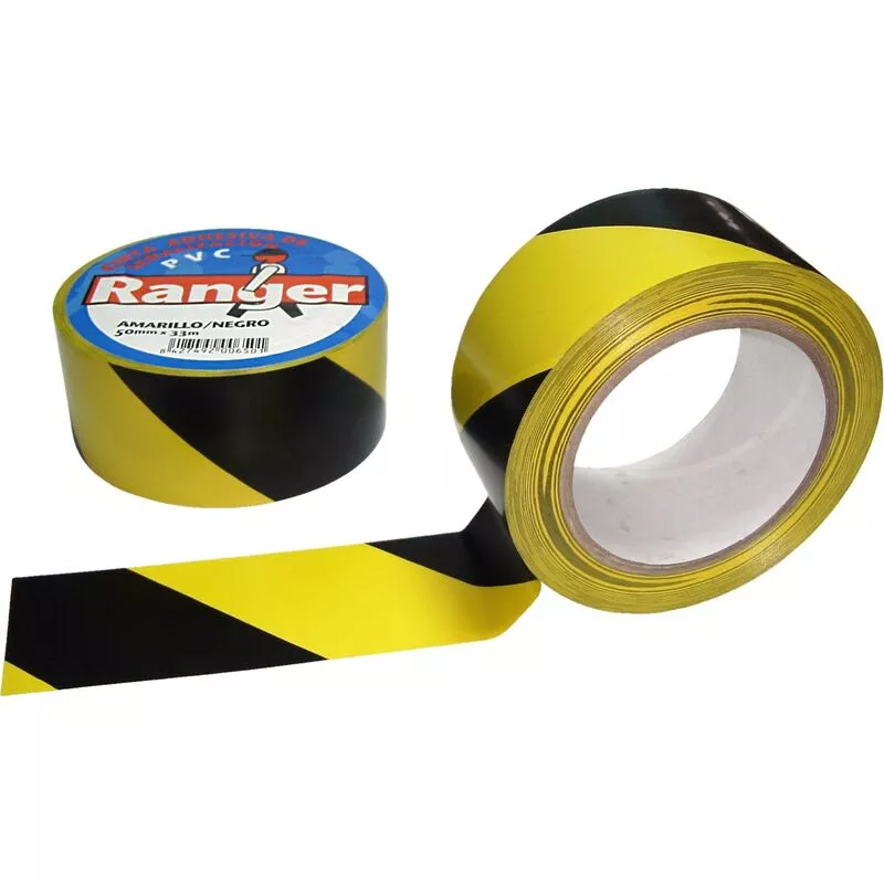 Rollo de cinta adhesiva de señalización en colores amarillo y negro. Cinta de 50 mm de ancho por 33 m de largo.