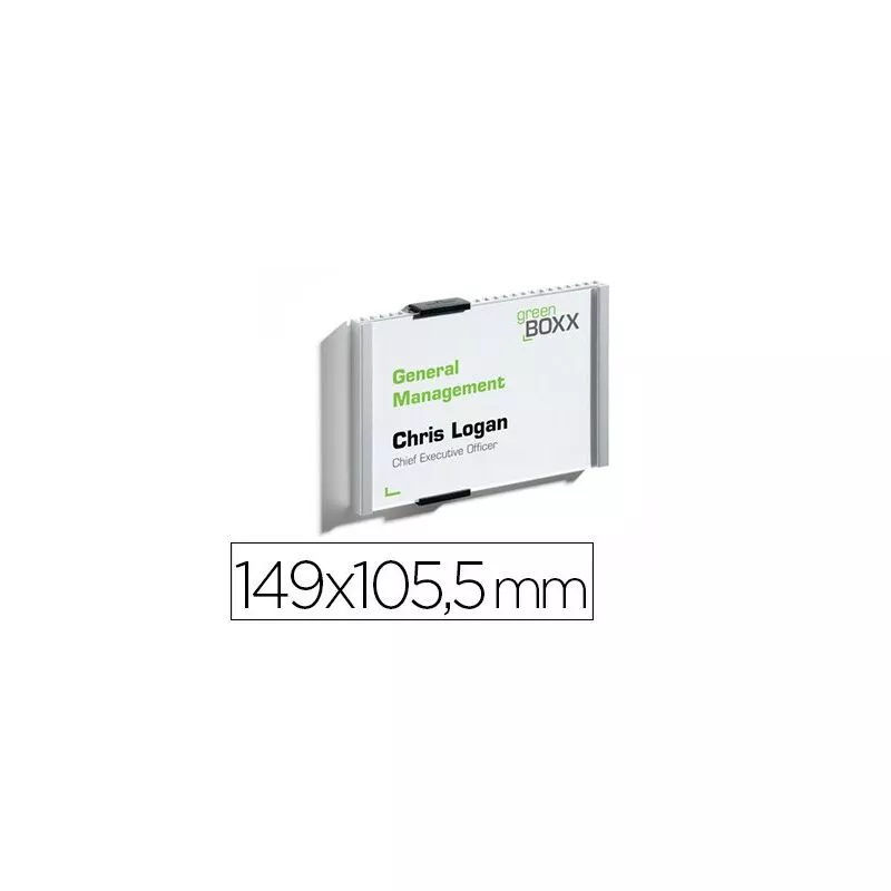 Identificador para puertas de aluminio con placas acrílicas antirreflectantes. Fácil de fijar a la pared con la banda adhesiva o los tornillos adjuntos. Las plantillas de impresión se descargan gratuitamente de la página web www.durable.eu. Incluye cartulina, material e instrucciones de montaje. Color: metálico plateado. Tamaño de la etiqueta: 149 x 105,5 mm.