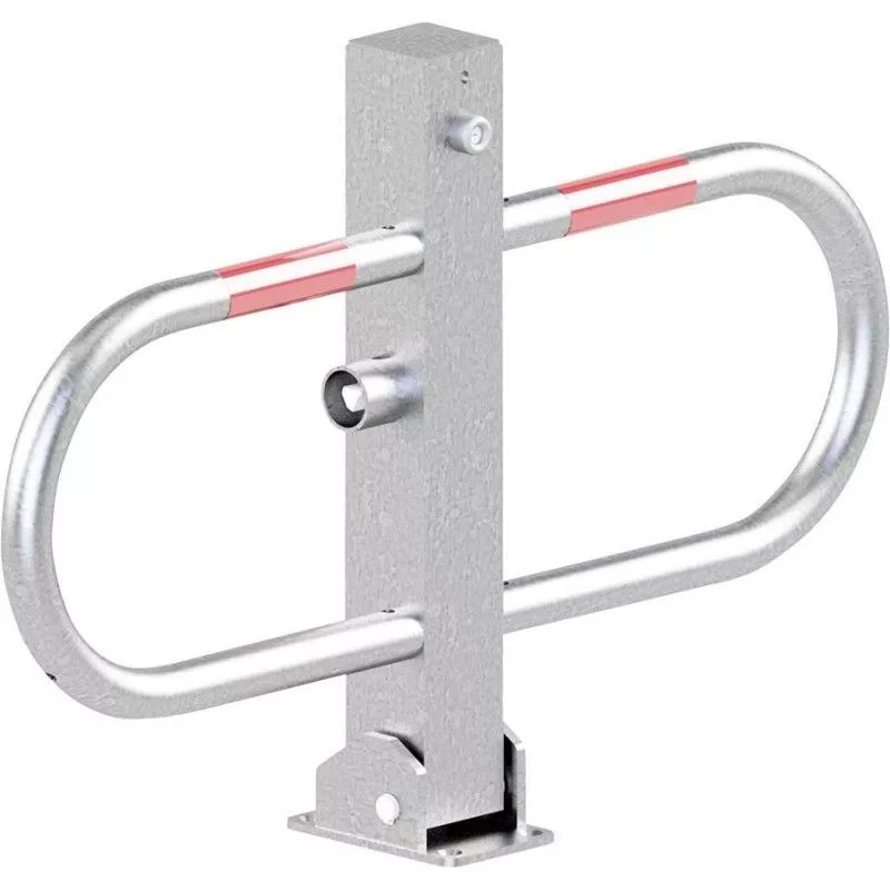 Barrera de aparcamiento galvanizada en caliente • Tubo cuadrado 70 x 70 mm • Galvanizado en caliente con tiras de luz reflectantes rojas • Relegable con cierre triangular según DIN 3223 • Bloqueo autoblocante con soportes laterales redondos para tubos • Para la fijación de la espiga • Con placa base de 100 x 150 mm o para fijación al manguito inferior
