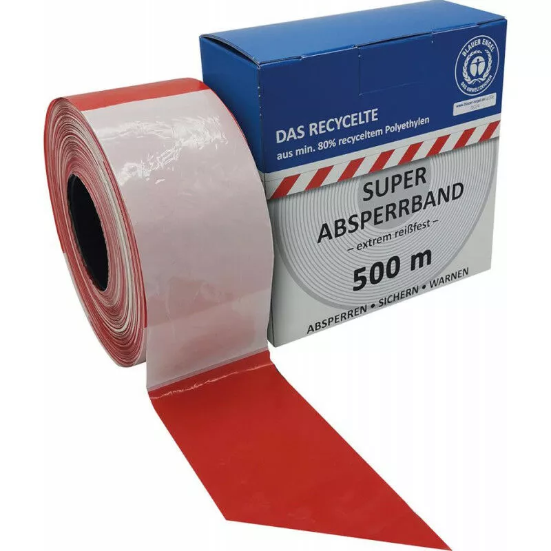 Rollo de cinta barrera de 500 m rojo / blanco Blue Angel fabricado con al menos un 80% de materias primas recicladas