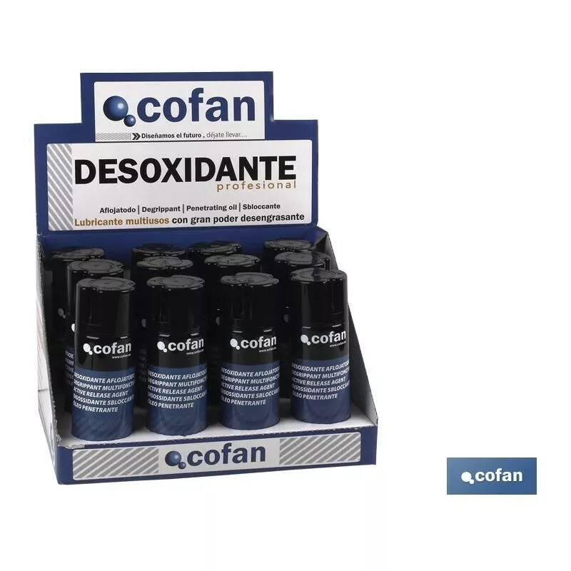 Expositor de 12 o de 20 envases de aflojatodo desoxidande con grafito incorporado mantiene un efecto muy prolongado y alto poder hidrófugo. Envases de 200ml y de 400ml