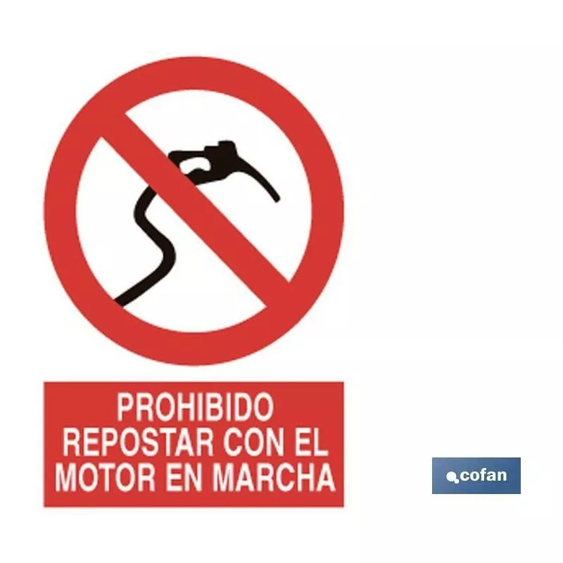 Señal Pictograma y Texto prohibido repostar motor en marcha en varias medidas y materiales.