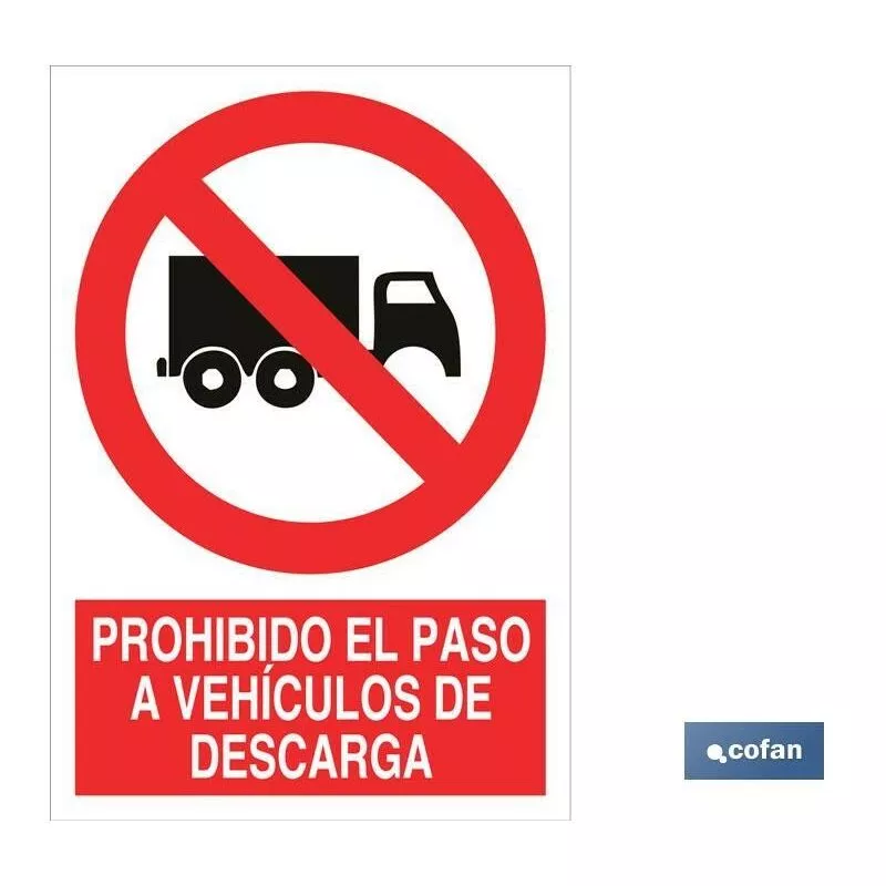 Señal Pictograma y Texto prohibido paso vehículos de descarga en varias medidas y materiales.