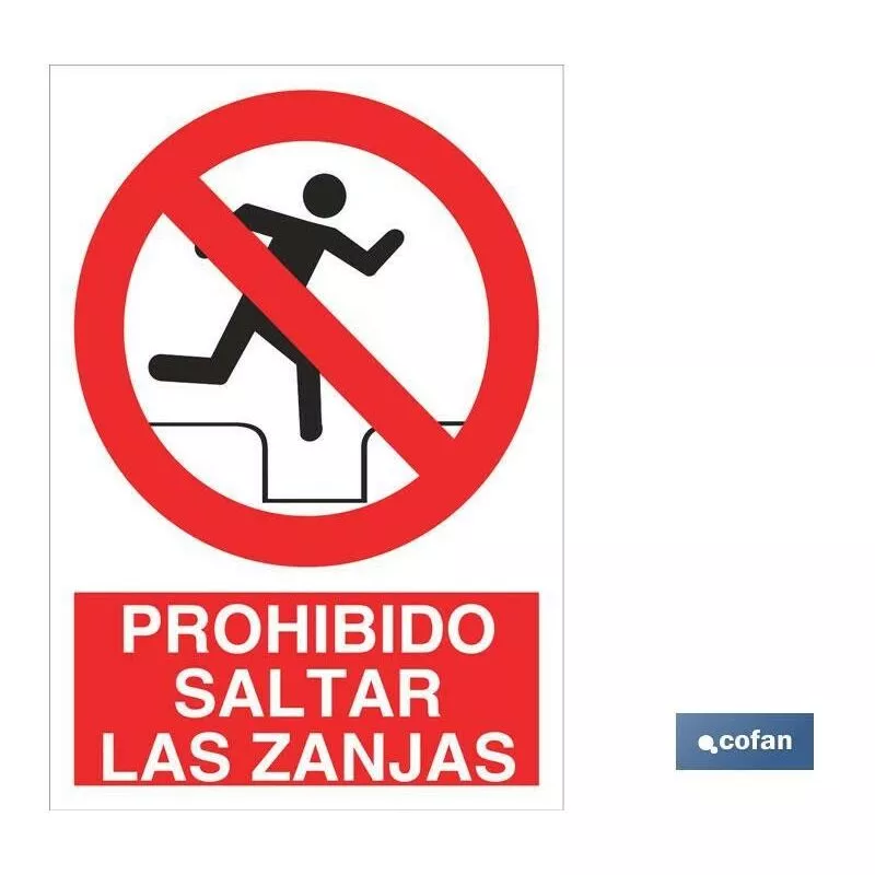 Señal Pictograma y Texto prohibido saltar zanjas en varias medidas y materiales.