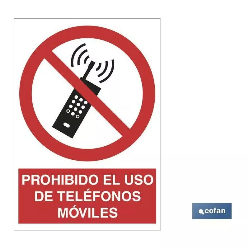 Señal Pictograma y Texto prohibido uso de teléfonos móviles en varias medidas y materiales.