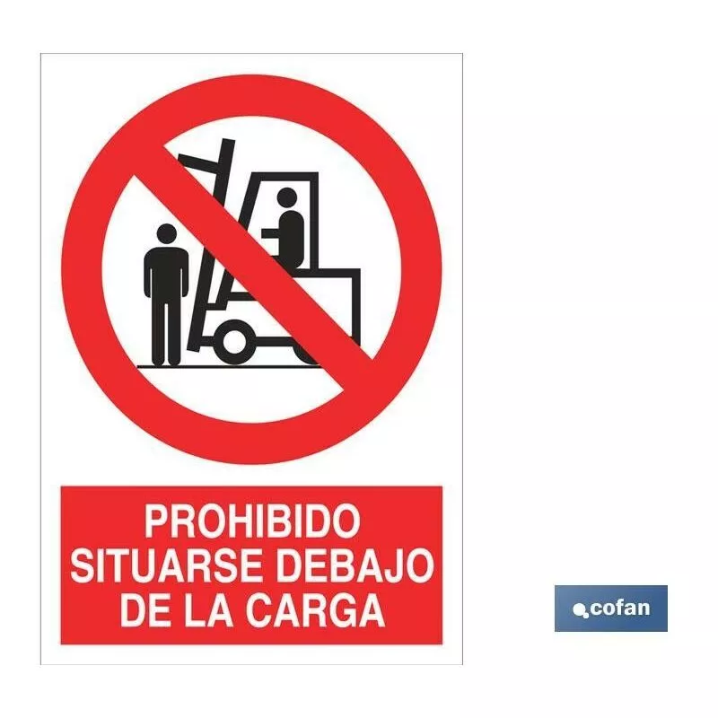 Señal Pictograma y Texto prohibido situarse debajo de la carga en varias medidas y materiales.