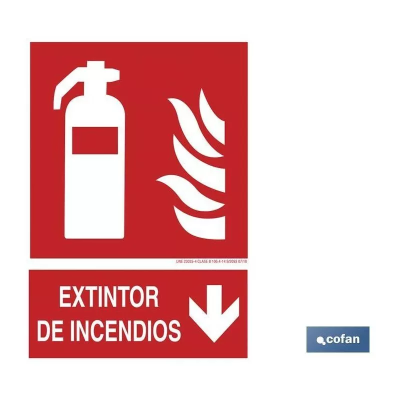 Señal de socorro Extintor de incendios abajo. Tamaño a elegir. Pictograma + Texto. Tamaño y material a elegir (luminiscente y adhesivo).