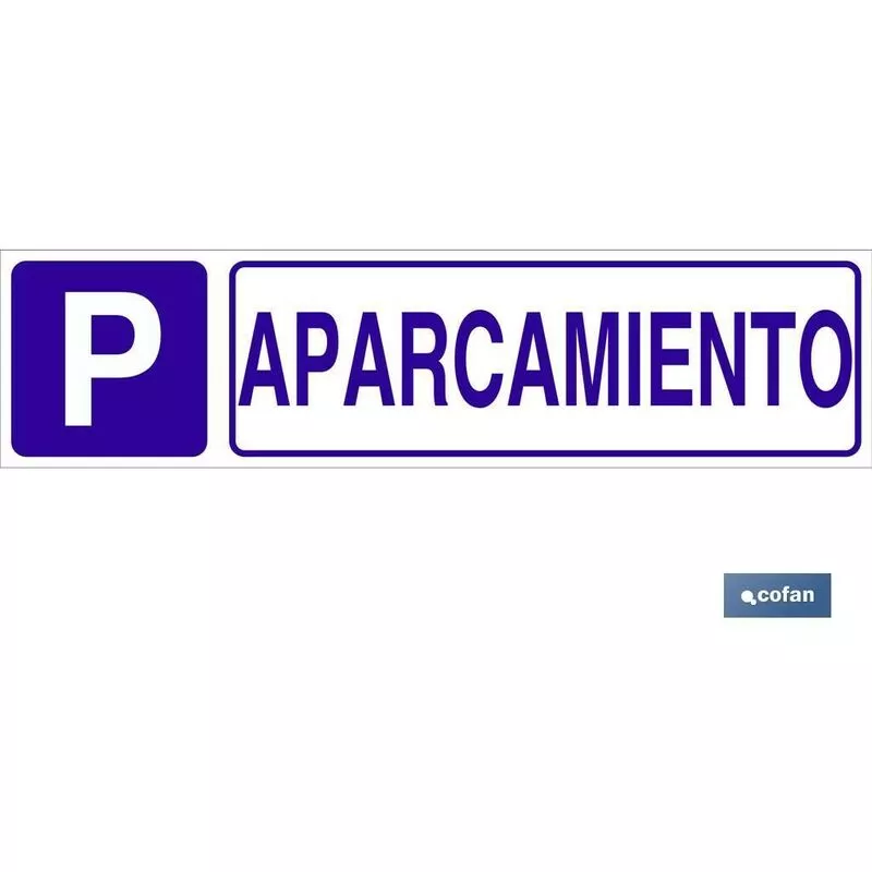 Señal informativa glasspack adhesiva con texto e imagen de aparcamiento.