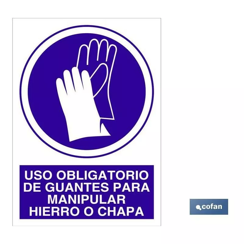 Señal de obligación Uso obligatorio de guantes para manipular hierro o chapa.