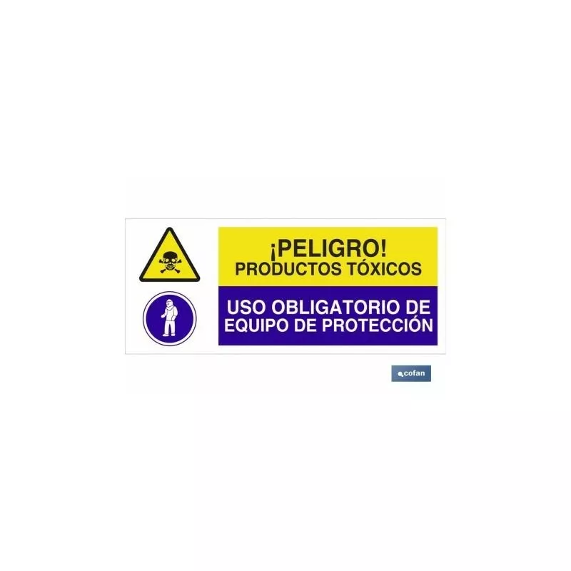 Señalización combinada de Peligro y Obligación. Medidas 507x210 mm y 717x297 mm Material Poliestireno. Pictograma y texto.ATENCIÓN PELIGRO PRODUCTOS TOXICOS - USAR EQUIPO DE PROTECCION
