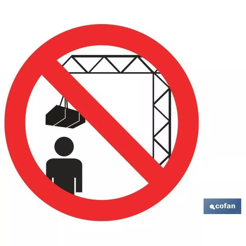 Señal Pictograma prohibido situarse debajo de la carga en varias medidas y materiales.