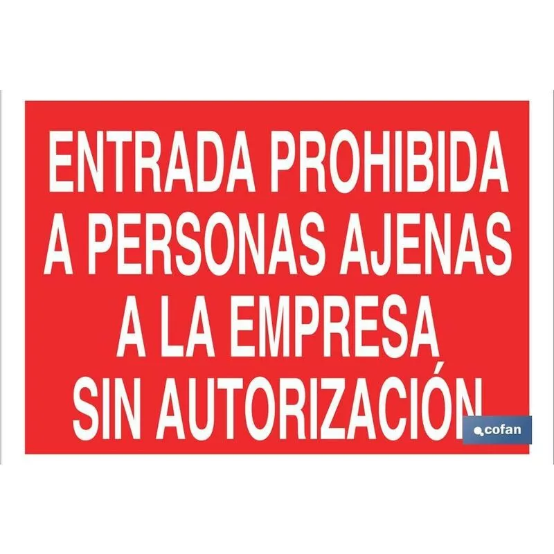 Señal de prohibición con texto Entrada prohibida a personas ajenas a la empresa sin autorización. Tamaño y material a elegir.