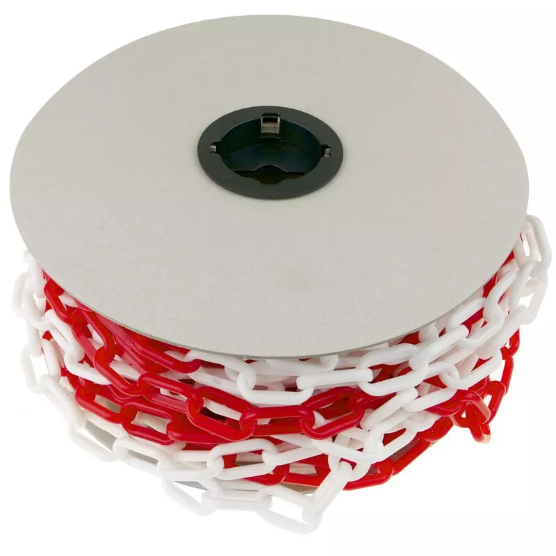 Cadena de plástico que combina los colores blanco y rojo. Fácilmente cortable en tramos segun necesidades del usuario. Cada eslabón tiene un tamaño de 35x20mm. Ideal para ser utilizado con los postes #BB91. Longitud total de 25m. Especificaciones Cadena de plástico de colores blanco y rojo, fácilmente cortable en tramos más cortos. Tamaño de cada eslabón: 35 x 20 mm. Longitud total: 25 m. Ideal para delimitar la circulación, restringir accesos, señalización, etc. Se puede utilizar conjuntamente con postes, bolardos, balizas, conos.