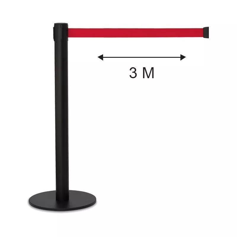 Práctico y útil poste separador de cinta retráctil extensible de 3 metros, para la delimitación y guiado de espacios. Muy resistente gracias a su estructura metálica y base en acero macizo de 35 cm de diámetro y 1 cm de altura fabricados con materiales de alta calidad. Cabezal con 4 vías, 3 de recepción y una de salida y entrada de cinta. Producto de montaje fácil y rápido. Adaptable a cualquier entono, ideal para todo tipo de empresas, negocios, comercios, oficinas y centros públicos. Ref.: 72103M Medidas: Altura: 95 cm Diámetro base: 35 cm Peso: 8 Kg. Colores cinta: Negro, Azul, Rojo. Color poste: Negro.