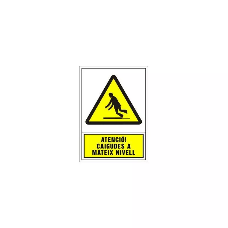 Senyal d'advert�ncia de caigudes al mateix nivell. En catal�. Mida petita. 34,5x24,5 cm.