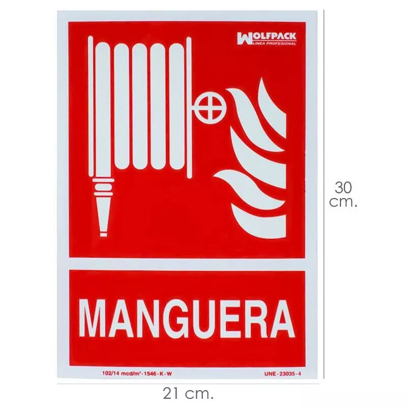Cartel Manguera. - Medida: 30 x 21 cm. - Cartel / señal fluorescente en la oscuridad. - Fabricado bajo norma UNE 23035/4. - Realizado en plastico. - Articulo también conocido como: carteles, rotulos, señales.
