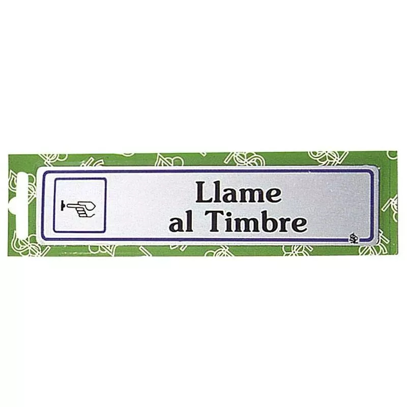 Rotulo llame al timbre - Medida: 17,5 x 4 cm. - Adhesivo. - Efecto metal. - 1 unidad. - Articulo también conocido como: carteles, rotulos, señales.