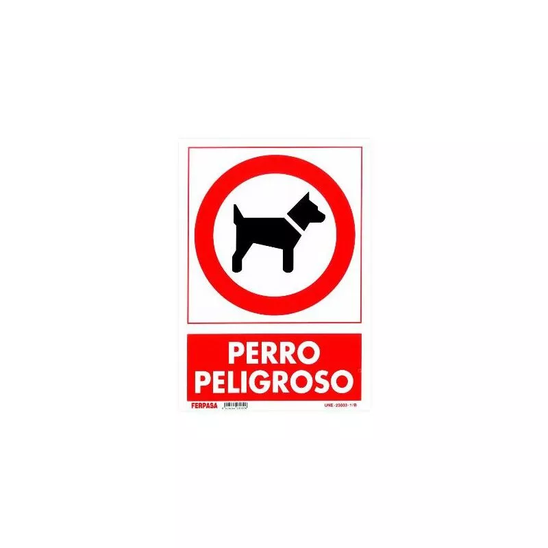 Cartel de prohibición 3030 ( Perro Peligroso ) Tamaño 29,7x21 cm Fabricado en PVC Color Blanco y Rojo Norma UNE.
